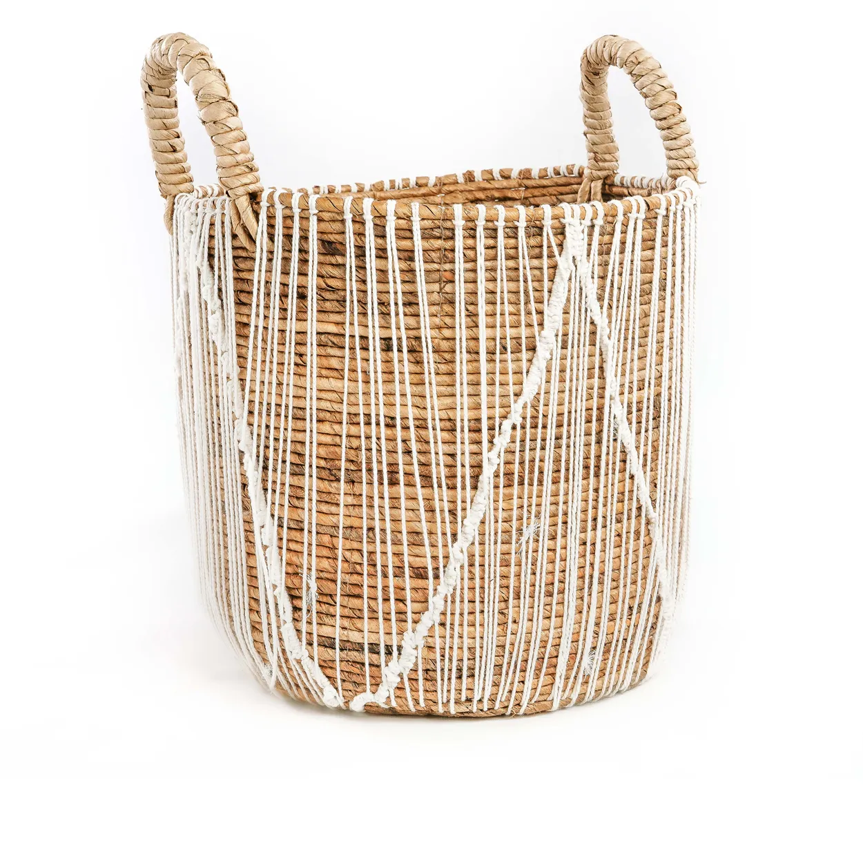 Kijk eens naar deze mand! Het is moeilijk om dat niet te doen, want het is een kunstwerk. De mand zelf is gemaakt van sterk, duurzaam zeegras dat een prachtige natuurlijke uitstraling heeft en jaren meegaat. Hij is versierd met een indrukwekkend patroon in wit katoen. Ideaal voor tijdschriften, speelgoed of zelfs een mooie potplant. En het mooiste: er zijn drie maten beschikbaar!