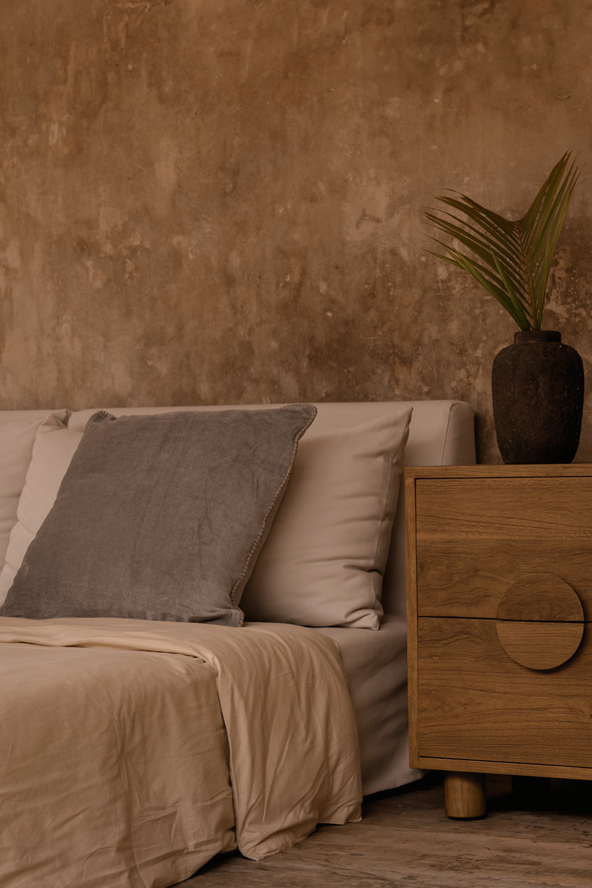 Elke kussensloop is uniek, gevormd door de natuurlijke eigenschappen van het materiaal. Lichte kleur- en textuurvariaties versterken de ambachtelijke uitstraling en creëren een perfecte fusie van comfort, design en duurzaamheid die je sofa transformeert in een stijlvolle plek van rust.