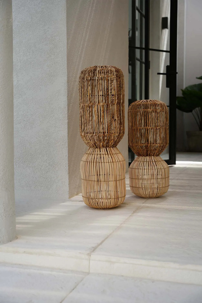 De ChemChem Lamp, vervaardigd uit bananenblad en riet, biedt veelzijdige stijl als hanglamp of vloerlamp. Het unieke ontwerp en de aardse texturen maken het een opvallend stuk dat prachtig aansluit bij boho, rustieke of kustinterieurs. Of het nu boven een eettafel hangt of elegant in een knusse hoek staat, de ChemChem Lamp straalt een warme, uitnodigende gloed uit die elke kamer transformeert in een serene toevluchtsoord. De handgemaakte details en natuurlijke materialen creëren een perfecte harmonie van functie en design. Deze lampenkap heeft geen elektrische bedrading of stekkers. We verkopen deze armaturen afzonderlijk, zowel plafondmontage als met stekker. Kijk in onze winkel voor een armatuur en kies uw gewenste uitstraling en type.